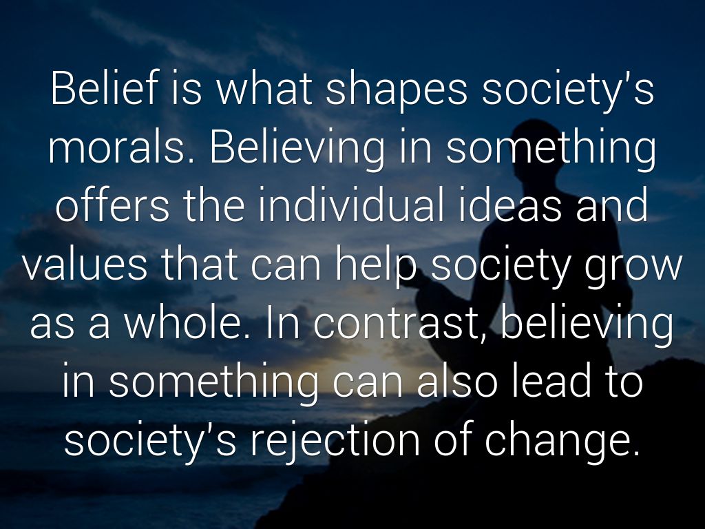 Belief is what shapes society's morals. Believing in something offers the individual ideas and values that can help society grow as a whole. In contrast, believing in something can also lead to society's rejection of change.