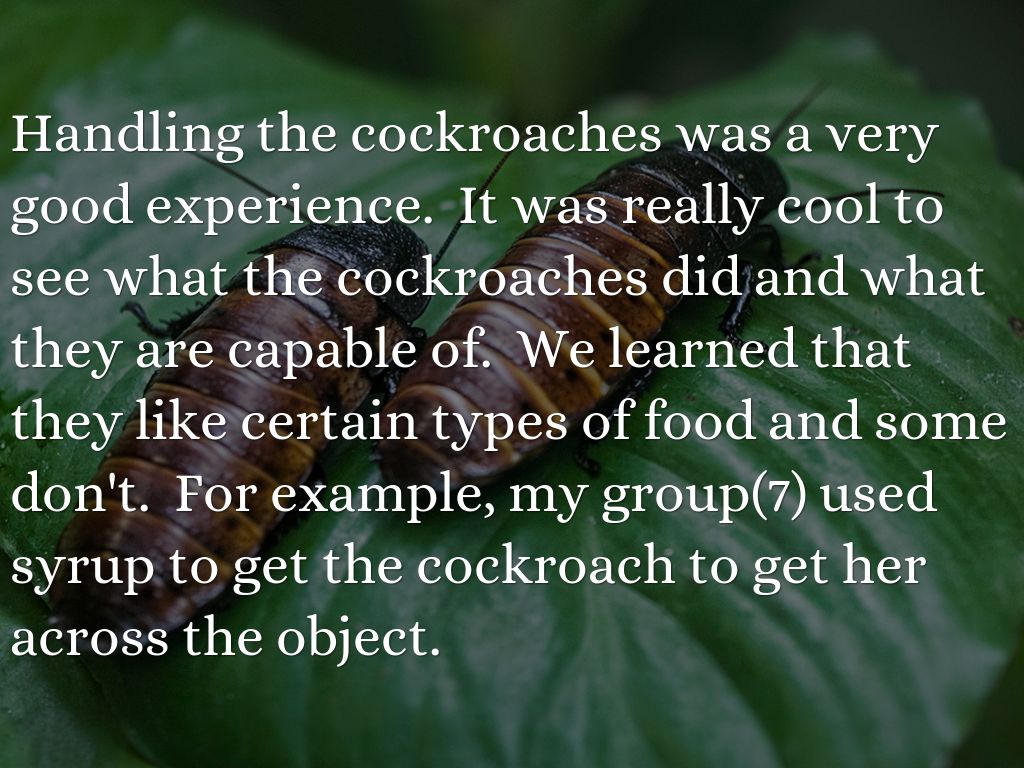 Handling the cockroaches was a very good experience. It was really cool to see what the cockroaches did and what they are capable of. We learned that they like certain types of food and some don't. For example, my group(7) used syrup to get the cockroach to get her across the object.