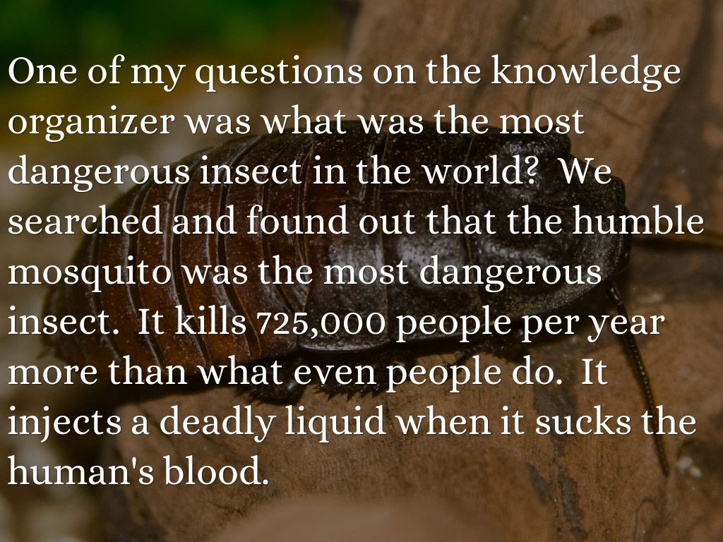 One of my questions on the knowledge organizer was what was the most dangerous insect in the world? We searched and found out that the humble mosquito was the most dangerous insect. It kills 725,000 people per year more than what even people do. It injects a deadly liquid when it sucks the human's blood.