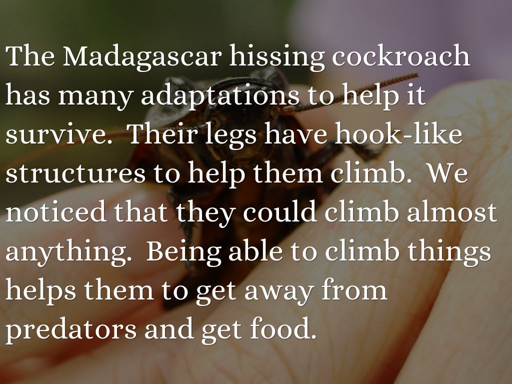 The Madagascar hissing cockroach has many adaptations to help it survive. Their legs have hook-like structures to help them climb. We noticed that they could climb almost anything. Being able to climb things helps them to get away from predators and get food.