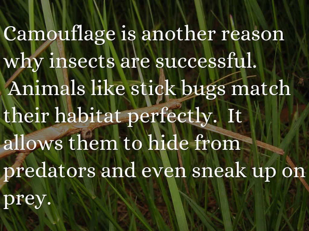 Camouflage is another reason why insects are successful. Animals like stick bugs match their habitat perfectly. It allows them to hide from predators and even sneak up on prey.