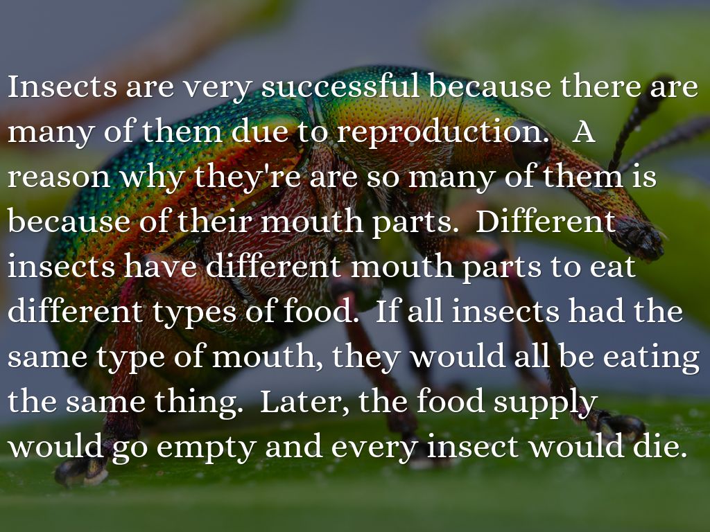 Insects are very successful because there are many of them due to reproduction. A reason why they're are so many of them is because of their mouth parts. Different insects have different mouth parts to eat different types of food. If all insects had the same type of mouth, they would all be eating the same thing. Later, the food supply would go empty and every insect would die.