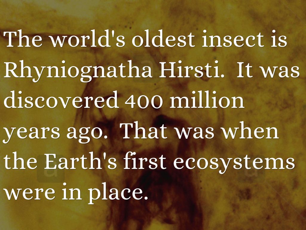 The world's oldest insect is Rhyniognatha Hirsti. It was discovered 400 million years ago. That was when the Earth's first ecosystems were in place.