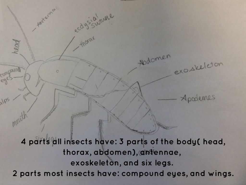 4 parts all insects have: 3 parts of the body( head, thorax, abdomen), antennae,