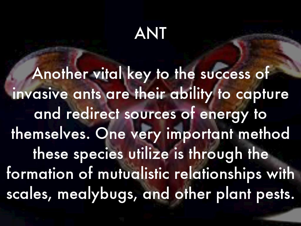 Another vital key to the success of invasive ants are their ability to capture and redirect sources of energy to themselves. One very important method these species utilize is through the formation of mutualistic relationships with scales, mealybugs, and other plant pests.