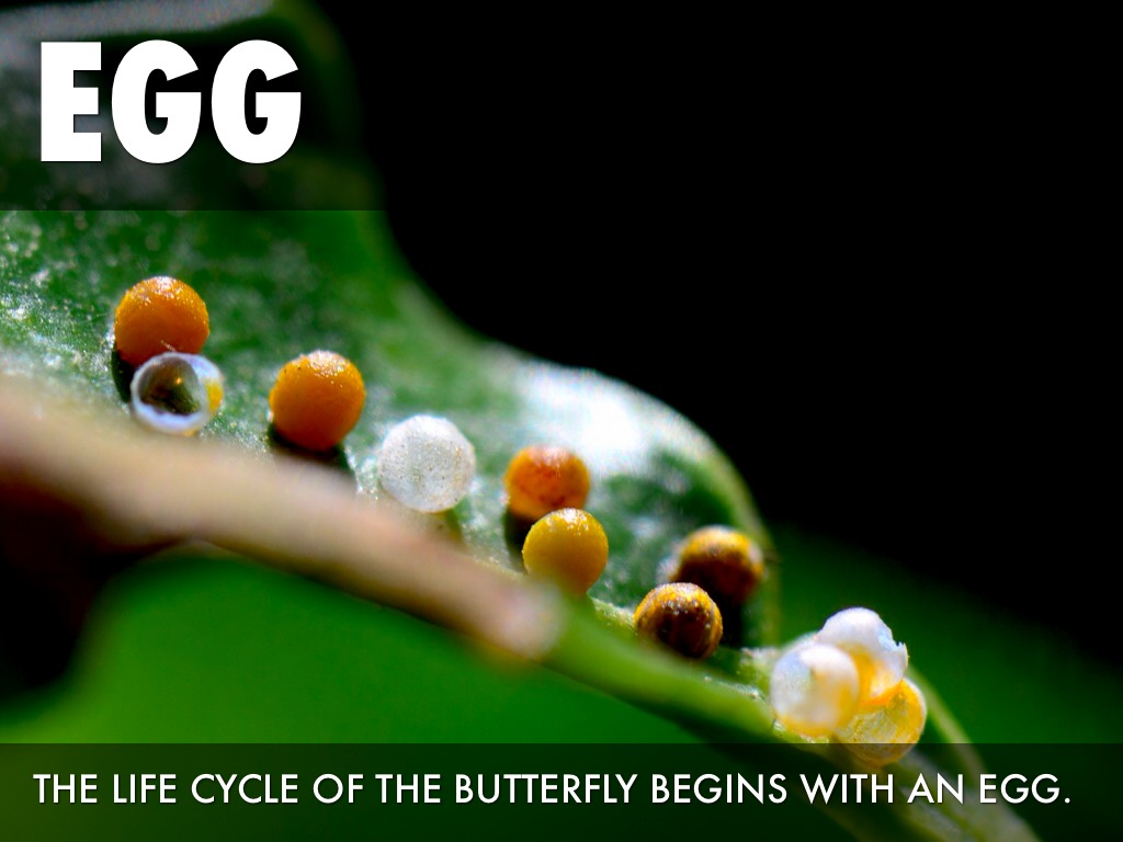 THE LIFE CYCLE OF THE BUTTERFLY BEGINS WITH AN EGG.