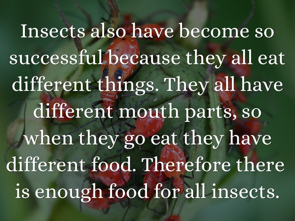 Insects also have become so successful because they all eat different things. They all have different mouth parts, so when they go eat they have different food. Therefore there is enough food for all insects.