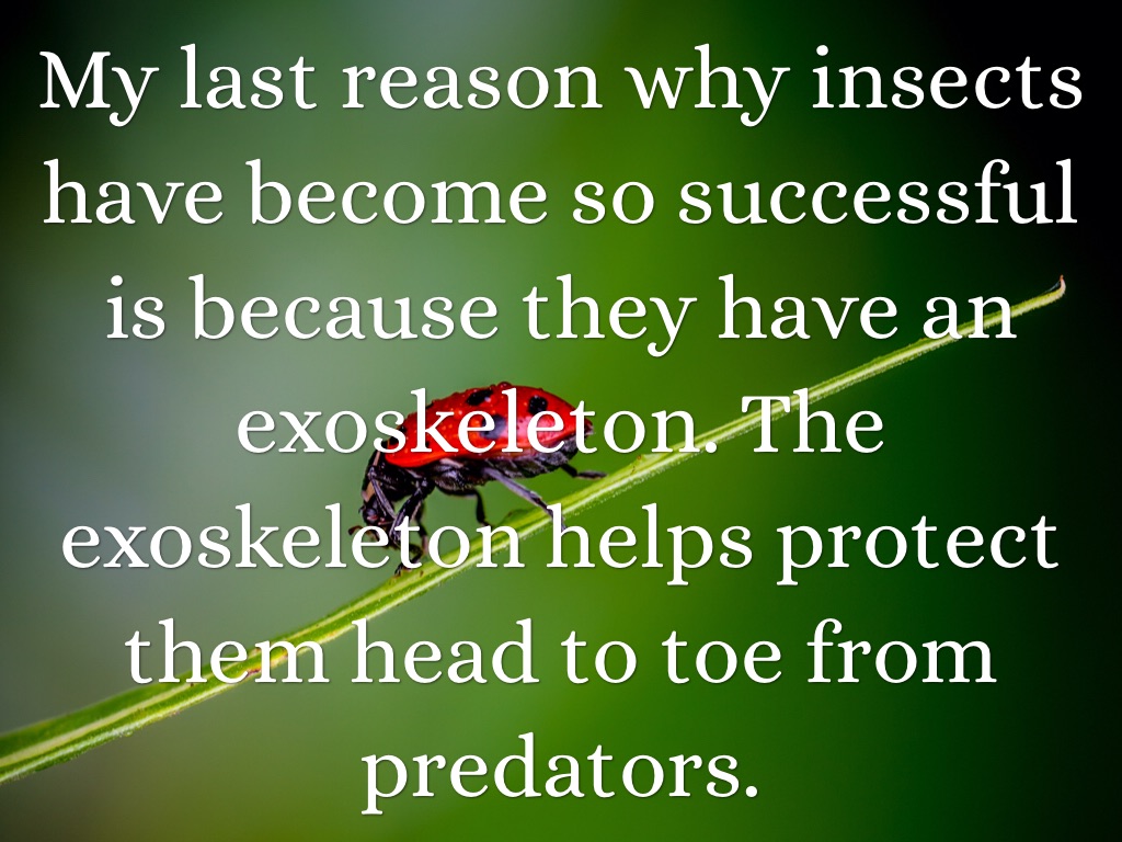 My last reason why insects have become so successful is because they have an exoskeleton. The exoskeleton helps protect them head to toe from predators.