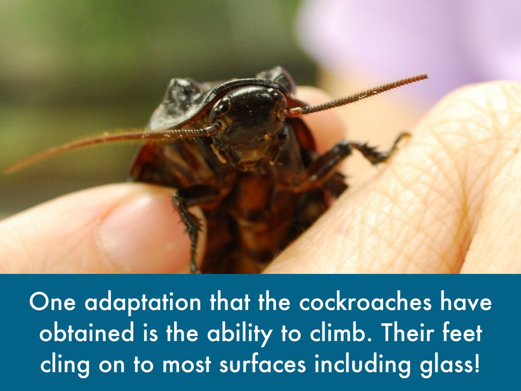 One adaptation that the cockroaches have obtained is the ability to climb. Their feet cling on to most surfaces including glass!