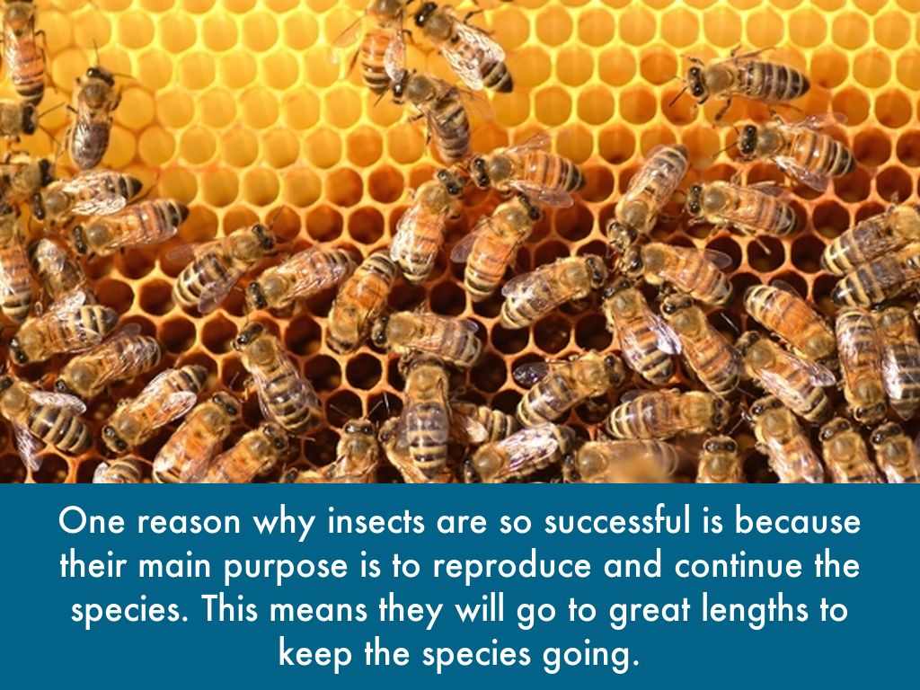 One reason why insects are so successful is because their main purpose is to reproduce and continue the species. This means they will go to great lengths to keep the species going.