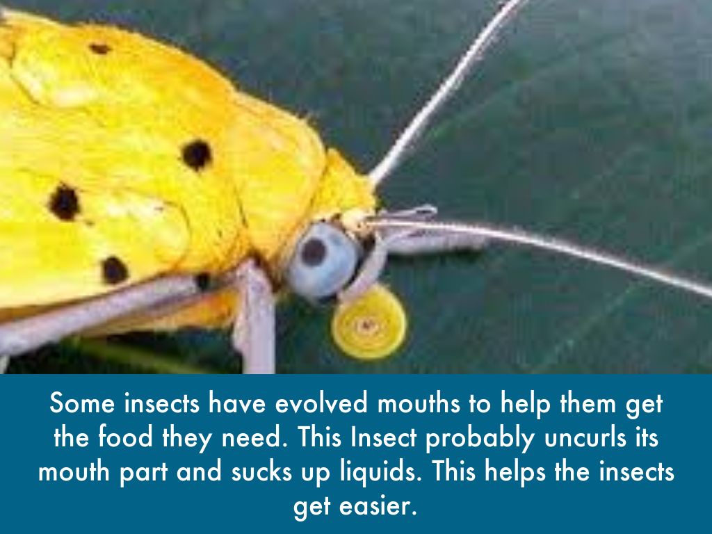 Some insects have evolved mouths to help them get the food they need. This Insect probably uncurls its mouth part and sucks up liquids. This helps the insects get easier.