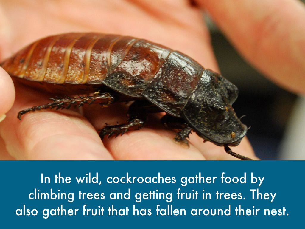 In the wild, cockroaches gather food by climbing trees and getting fruit in trees. They also gather fruit that has fallen around their nest.