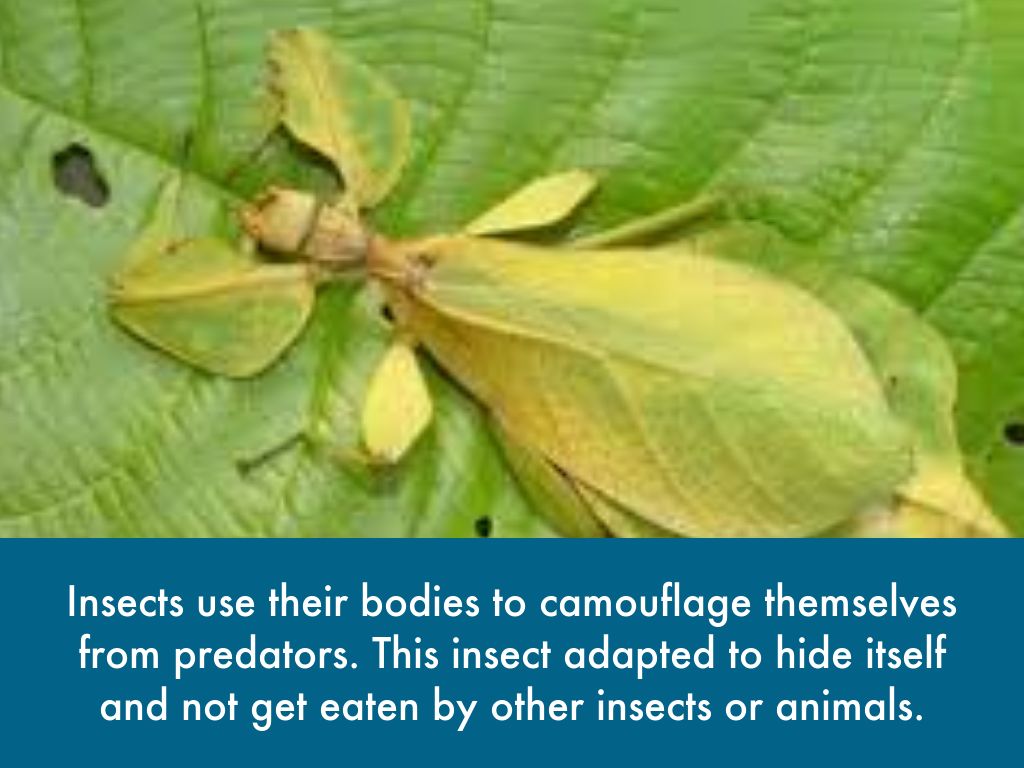 Insects use their bodies to camouflage themselves from predators. This insect adapted to hide itself and not get eaten by other insects or animals.