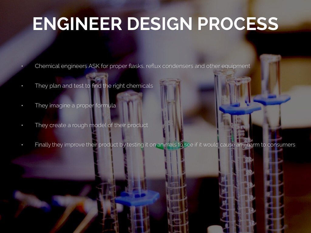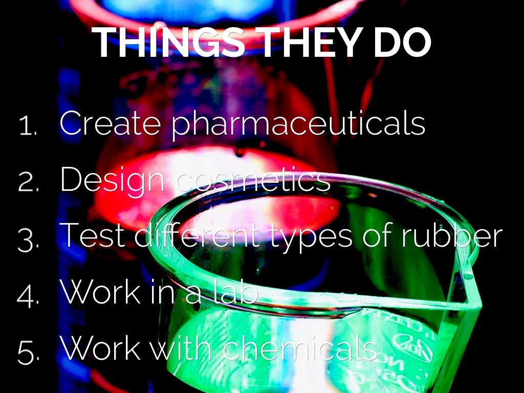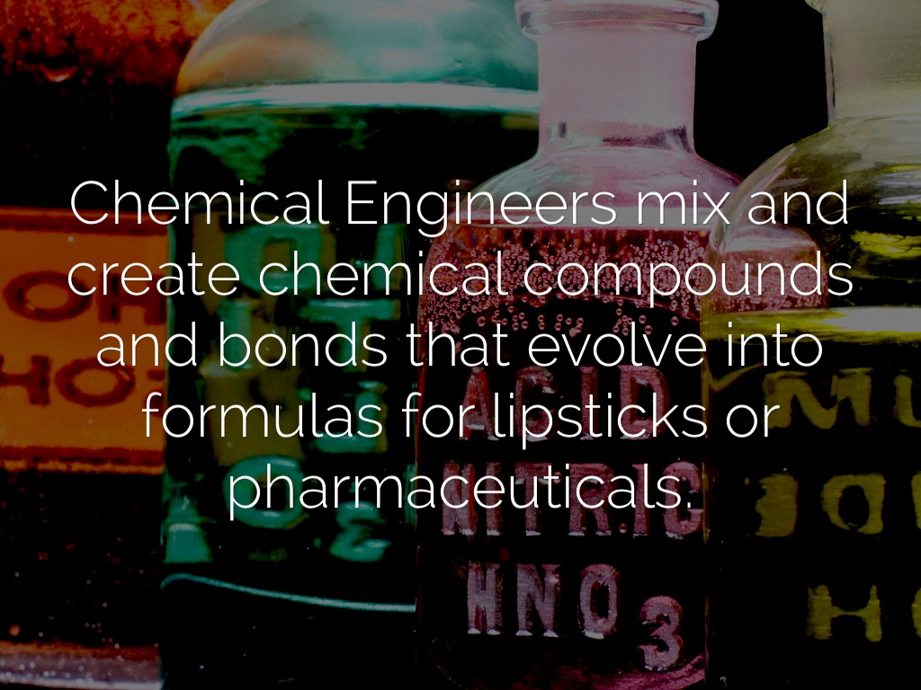 Chemical Engineers mix and create chemical compounds and bonds that evolve into formulas for lipsticks or pharmaceuticals.