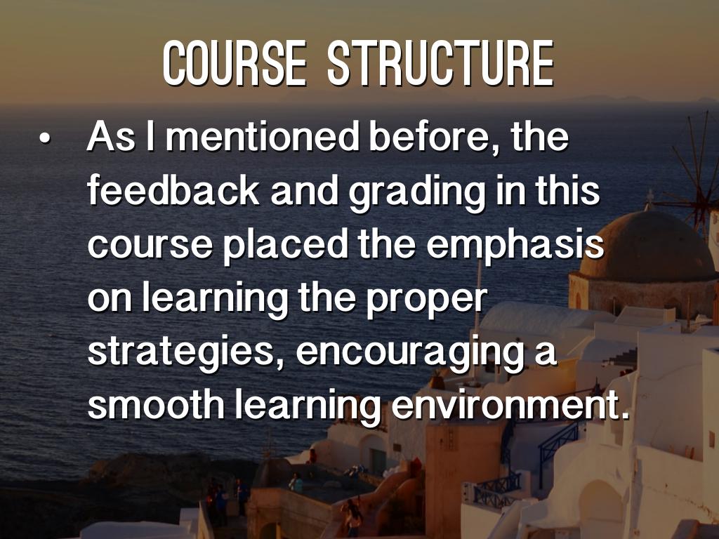 As I mentioned before, the feedback and grading in this course placed the emphasis on learning the proper strategies, encouraging a smooth learning environment.