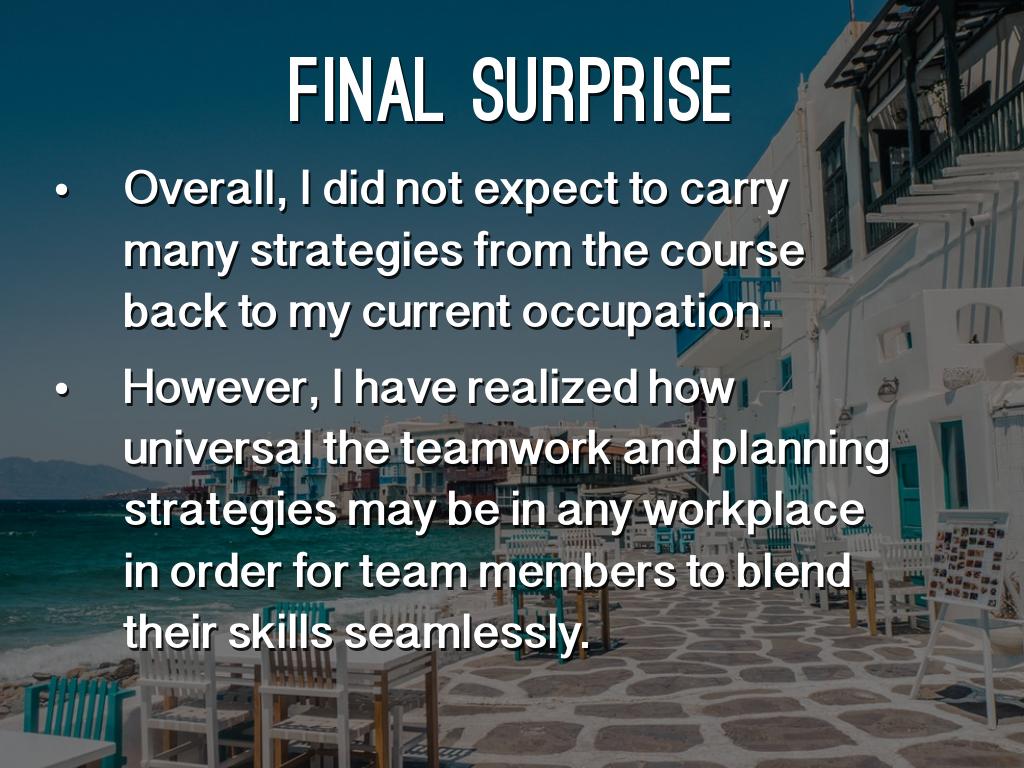 However, I have realized how universal the teamwork and planning strategies may be in any workplace in order for team members to blend their skills seamlessly.