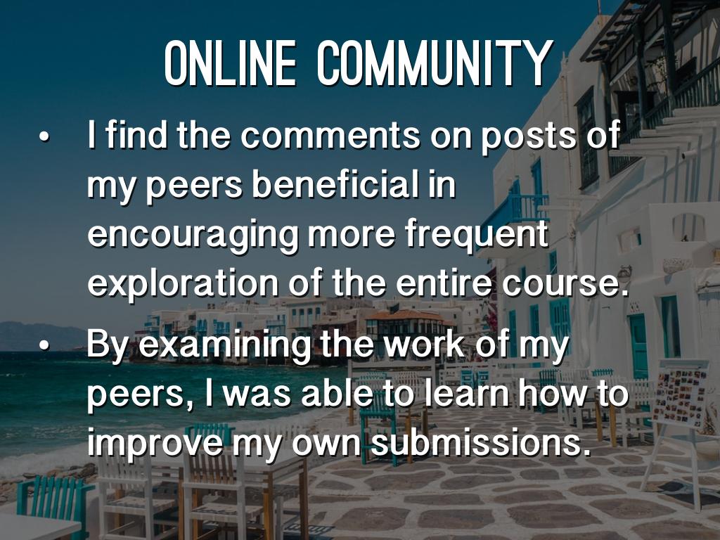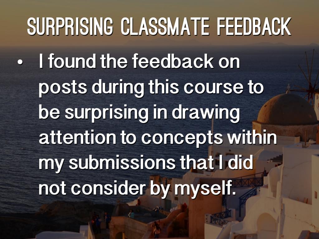 I found the feedback on posts during this course to be surprising in drawing attention to concepts within my submissions that I did not consider by myself.
