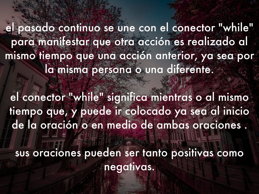 el pasado continuo se une con el conector "while" para manifestar que otra acción es realizado al mismo tiempo que una acción anterior, ya sea por la misma persona o una diferente.