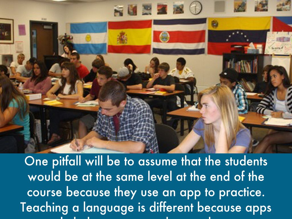 One pitfall will be to assume that the students would be at the same level at the end of the course because they use an app to practice. Teaching a language is different because apps help but cannot replace a class.