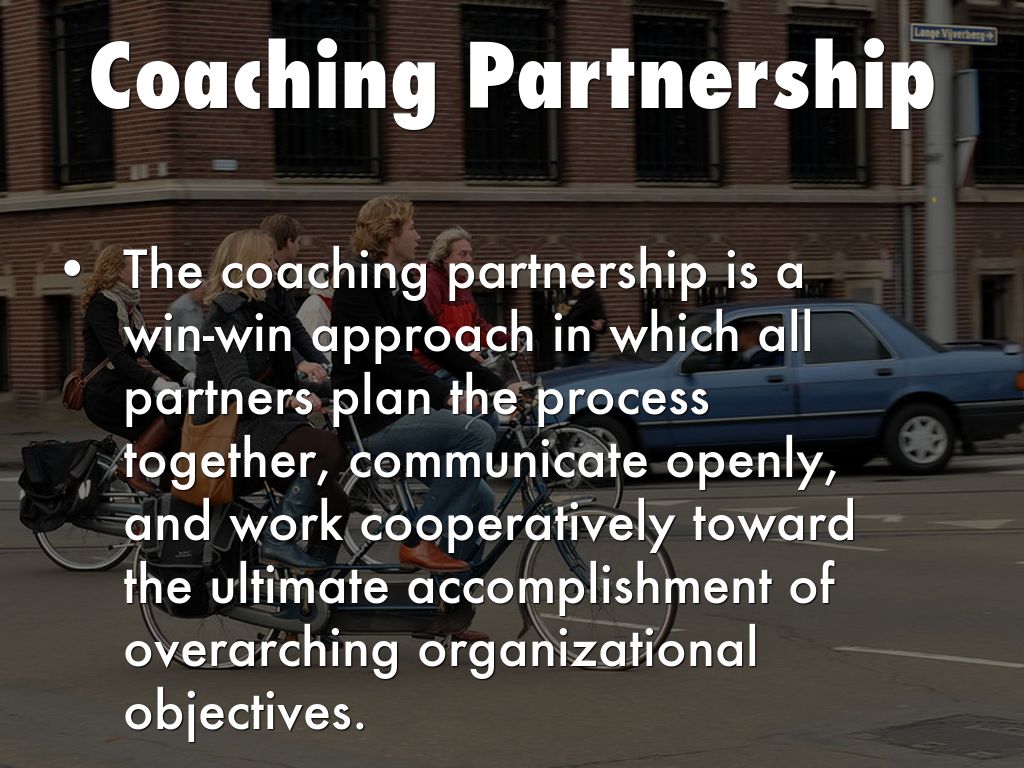 The coaching partnership is a win-win approach in which all partners plan the process together, communicate openly, and work cooperatively toward the ultimate accomplishment of overarching organizational objectives.