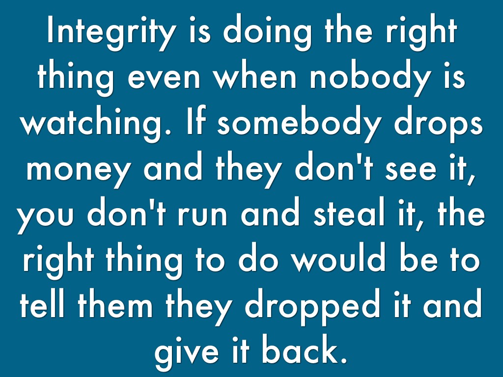 Integrity is doing the right thing even when nobody is watching. If somebody drops money and they don't see it, you don't run and steal it, the right thing to do would be to tell them they dropped it and give it back.