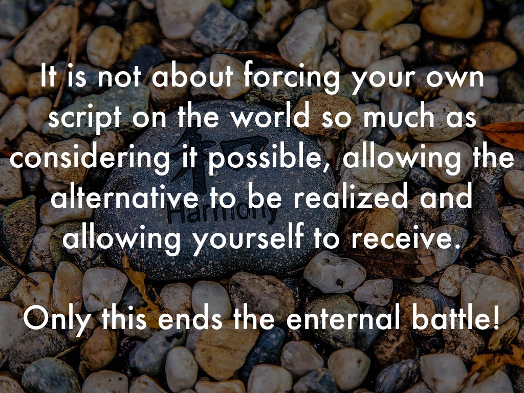 It is not about forcing your own script on the world so much as considering it possible, allowing the alternative to be realized and allowing yourself to receive.