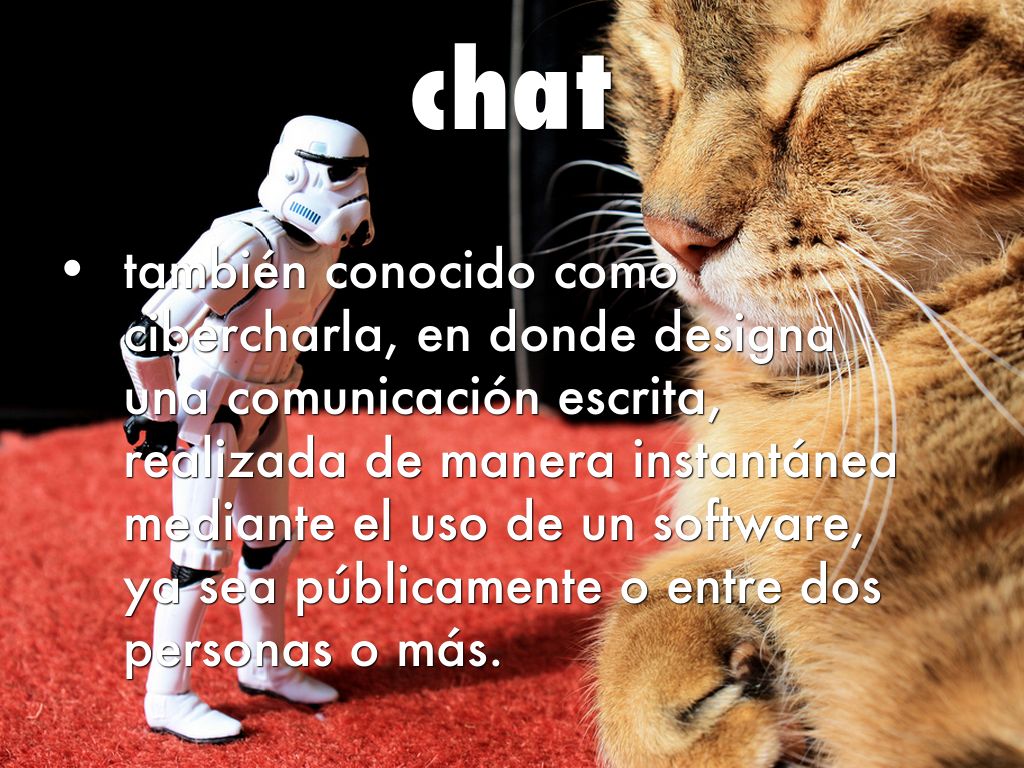 también conocido como cibercharla, en donde designa una comunicación escrita, realizada de manera instantánea mediante el uso de un software, ya sea públicamente o entre dos personas o más.