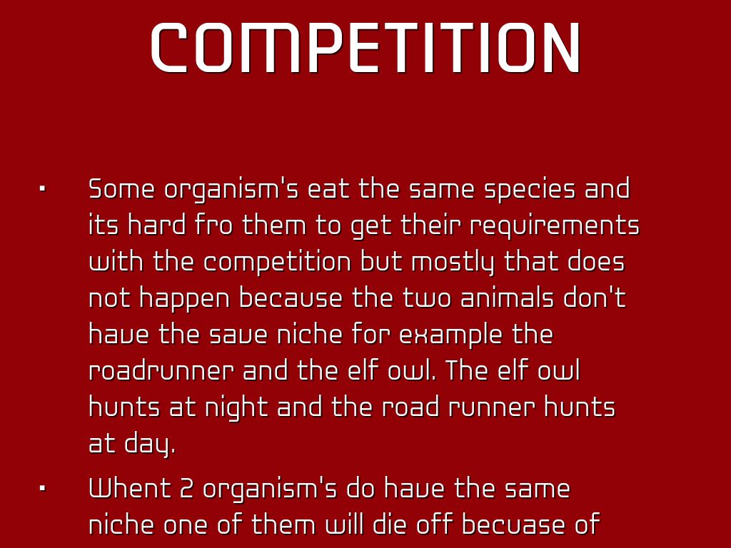 Some organism's eat the same species and its hard fro them to get their requirements with the competition but mostly that does not happen because the two animals don't have the save niche for example the roadrunner and the elf owl. The elf owl hunts at night and the road runner hunts at day.
