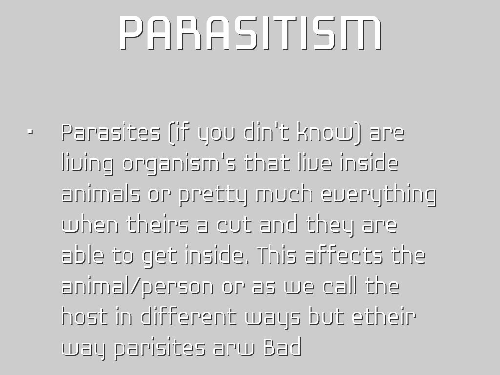 Parasites (if you din't know) are living organism's that live inside animals or pretty much everything when theirs a cut and they are able to get inside. This affects the animal/person or as we call the host in different ways but etheir way parisites arw Bad