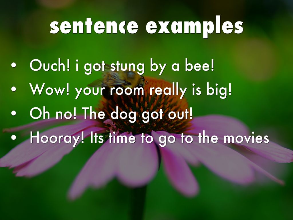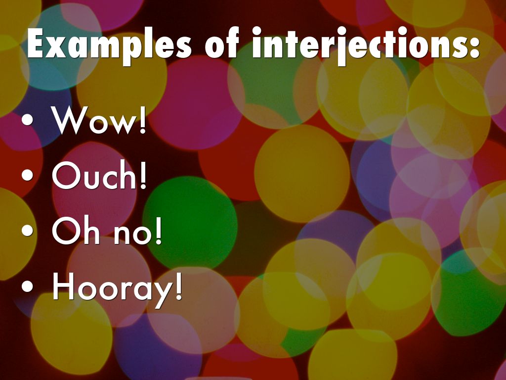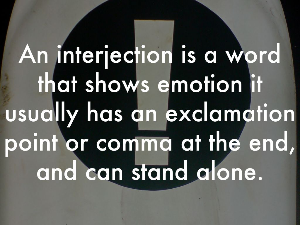An interjection is a word that shows emotion it usually has an exclamation point or comma at the end, and can stand alone.