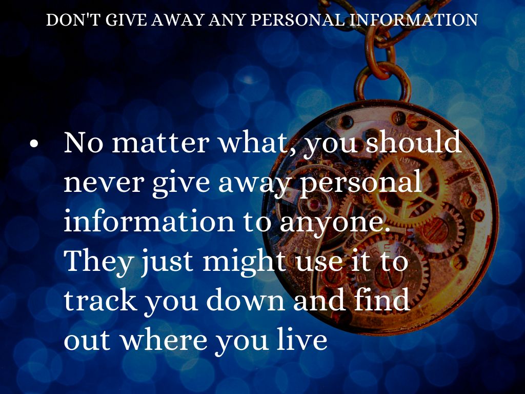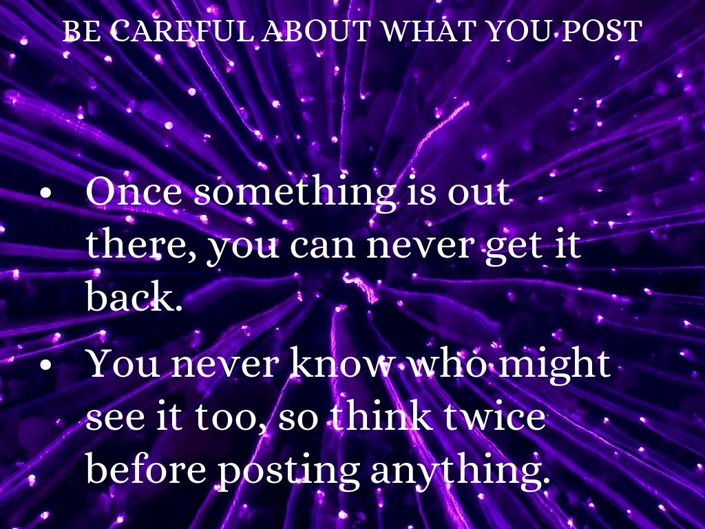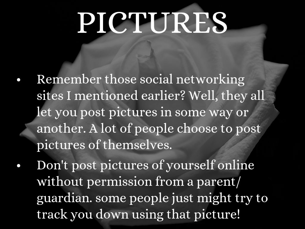 Don't post pictures of yourself online without permission from a parent/ guardian. some people just might try to track you down using that picture!
