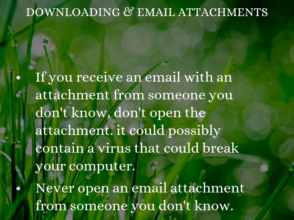 If you receive an email with an attachment from someone you don't know, don't open the attachment. it could possibly contain a virus that could break your computer.