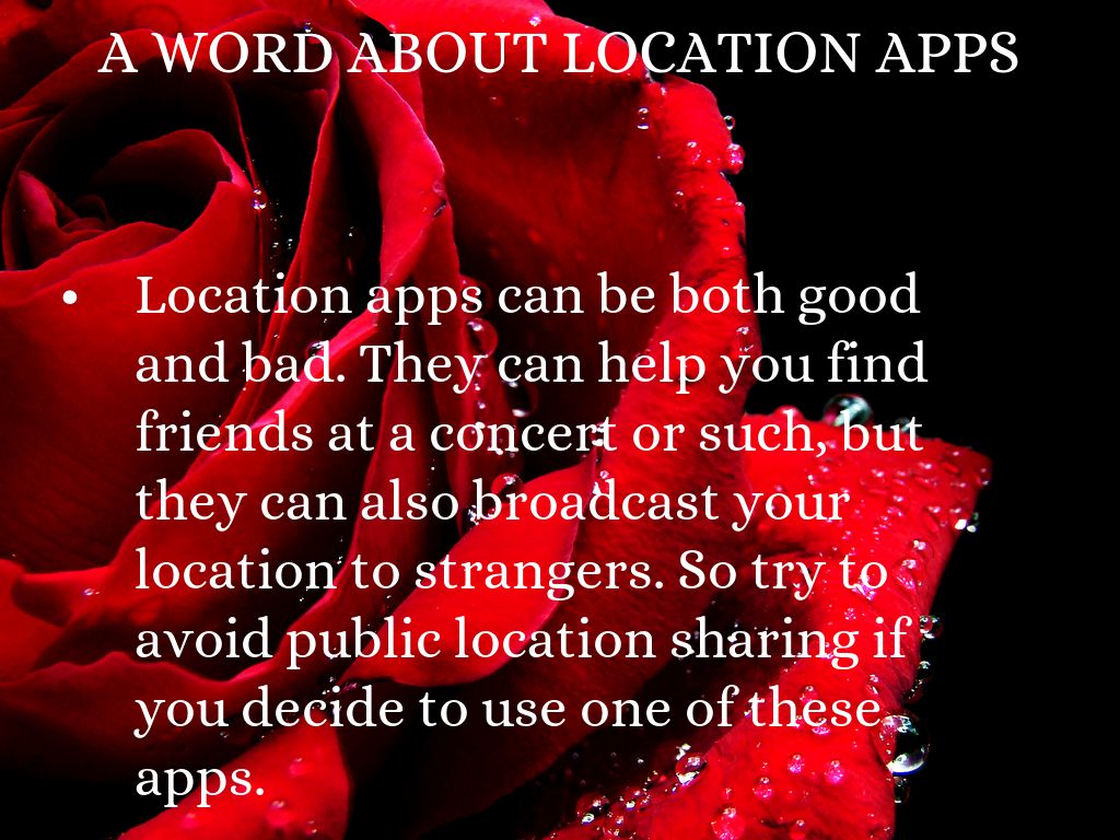 Location apps can be both good and bad. They can help you find friends at a concert or such, but they can also broadcast your location to strangers. So try to avoid public location sharing if you decide to use one of these apps.