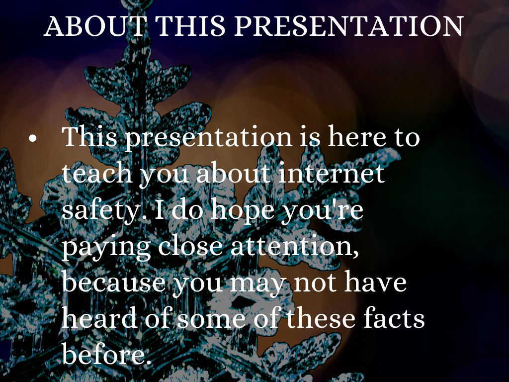 This presentation is here to teach you about internet safety. I do hope you're paying close attention, because you may not have heard of some of these facts before.