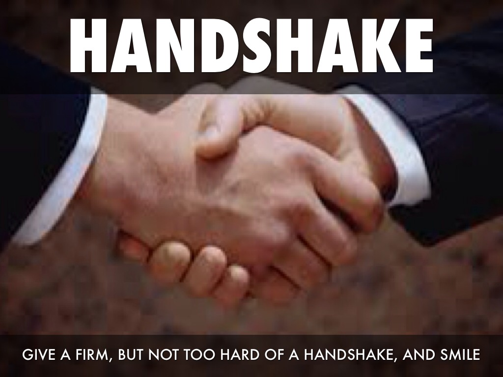 GIVE A FIRM, BUT NOT TOO HARD OF A HANDSHAKE, AND SMILE