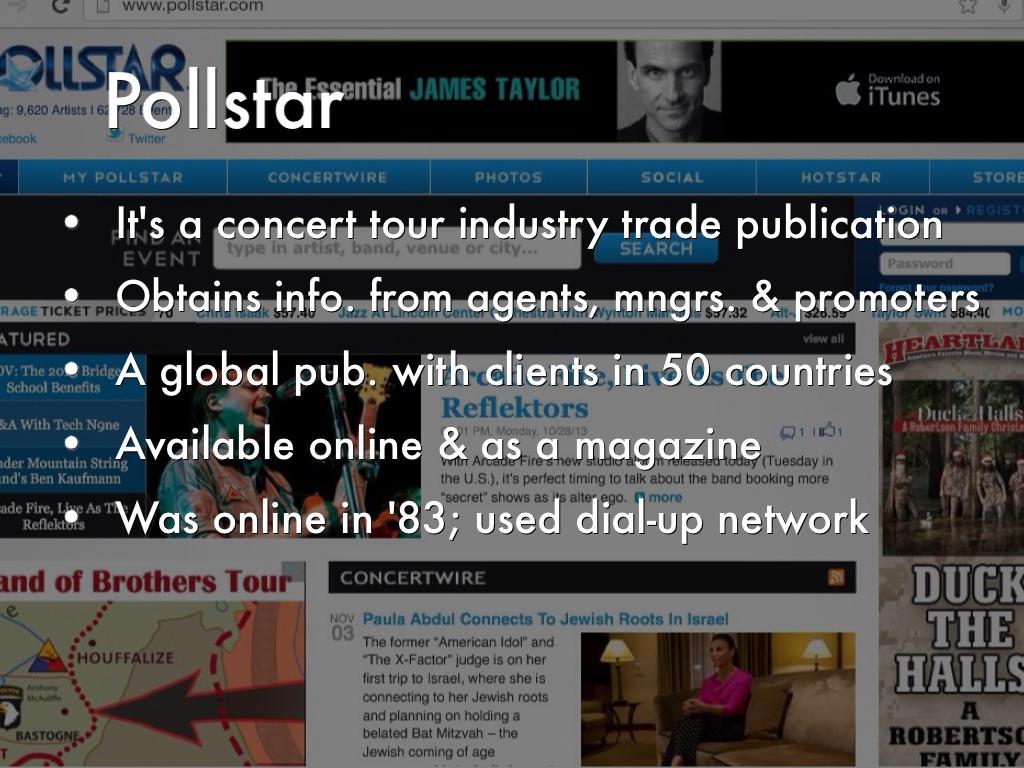 Pollstar is a concert tour industry trade publication that obtains its information from the agents, managers and promoters who produce concerts.