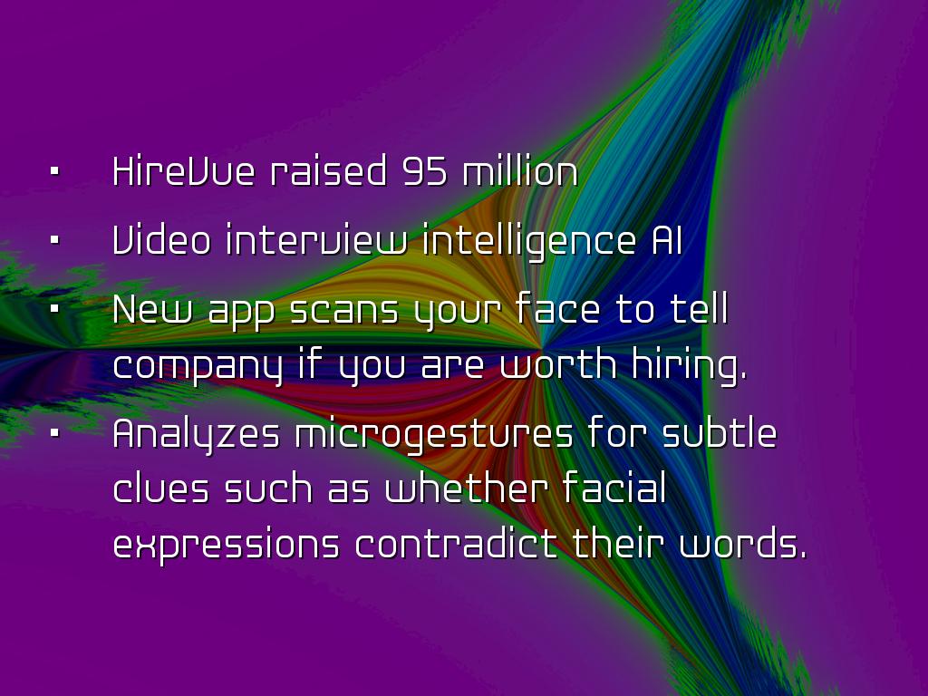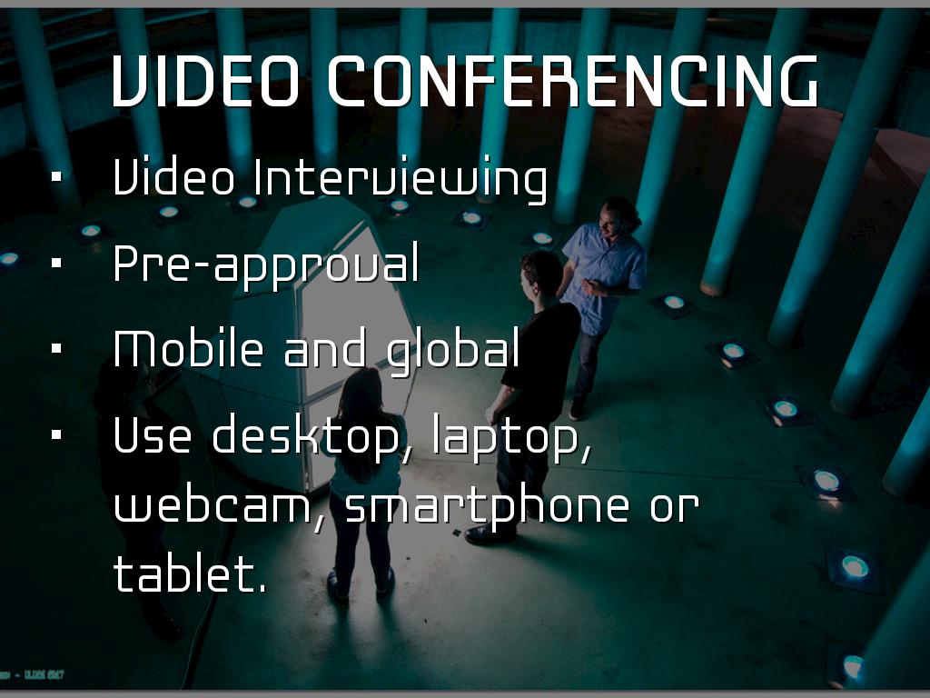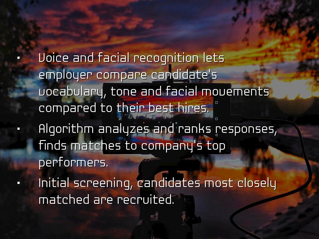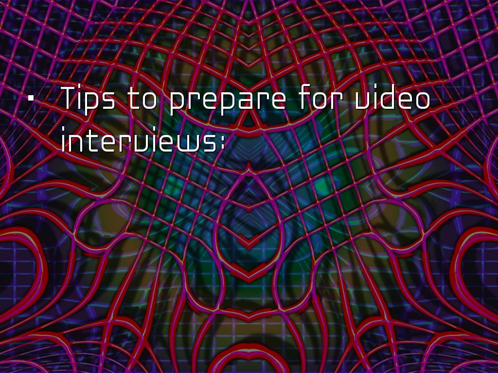 PRESENTATION OUTLINEVideo Conferencing Video Interviewing Pre-approval Mobile and global Use desktop, laptop, webcam, smartphone or tablet. WebEx Features WebEx-video teleconference Meet from any device. Just answer telephone. Personal meeting room. Screen sharing, white board and editing tools. Other Video Conferencing Google hangout Skype for Business AnyMeeting EzTalks Cloud Meeting Join me, Zoom, Vsee, GoToWebinar, Meeting Burner Job Interview Apps Interview Apps - a few Interview Assistant Interview Genius 51 most common interview questions JobJuice Prepare, Prepare, Prepare Some users reported, saw own face on screen, they felt uncomfortable. Took about 15 seconds used to seeing their face. Communication occurs through vocabulary, non verbal cues, tone of voice, inflection, pauses, facial expressions, manner of listening, microgestures, etc. Before the Interview Which technology does the company plan to use? Who will be interviewing? How long will interview last? If it is at a facility, arrive 15 minutes early. Practice set up prior to interview. What to Wear Consider a pastel rather than white which may glare. If wearing white, wear jacket to cut down on glare. Red should be avoided. No flashy jewelry, can catch the light. Try to avoid all light or all dark. Too much light clothing, camera automatically darkens. Face shadowed. Set-up at Home Test equipment Put computer solid surface Allow as much lighting as possible. Lighting in front of you, preferably from above. Background - blank wall Wear a bit more make-up If picture or window behind, see that light does not bounces off surface. End of Interview Questions Contact information? What next steps? Another interview? Who is main contact? Preferred contact method? Send interview thank you note. Untitled Slide People prefer to make judgements about people. 99.4% trying to confirm impression interviewer formed in first 10 seconds. Forget about grades Grit, passion and persistence Experience did not equal sales success, need team players Untitled Slide Used by Goldman Sachs, Armour, Unilever, Vodafone, Johnson & Johnsons, FedEx Structured process which is supposed to eliminate bias, however... Behind each robot lies a human. Bias is inherent. Untitled Slide As machine learning enables computers to teach themselves medical diagnostics, how to rate customer satisfaction to cars that drive themselves and Woebot that acts as an on demand therapist. San Francisco based Mya Systems developed AI recruiter evaluates resumes, schedules and conducts applicant screenings and also congratulates you on first day of work. Untitled Slide HireVue raised 95 million Video interview intelligence AI New app scans your face to tell company if you are worth hiring. Analyzes microgestures for subtle clues such as whether facial expressions contradict their words. Untitled Slide Voice and facial recognition lets employer compare candidate's vocabulary, tone and facial movements compared to their best hires. Algorithm analyzes and ranks responses, finds matches to company's top performers. Initial screening, candidates most closely matched are recruited. Untitled Slide Look at 4,000 candidates and within a few days whittle it down to the top 2% to 3%. It is not perfect, but it is faster and attempts to thwart human bias. Untitled Slide Might not be just video Applicant to prepare text question to send email to anxious customer with product question. Untitled Slide Tools make jobs more efficient, however inherently biased. Working on lessening human interventions, thereby reducing human bias. Untitled Slide Tips to prepare for video interviews: Untitled Slide Assesses which words he or she favors. Use please and thank you shows empathy and a possible disposition for working with customers. Untitled Slide Scanning candidate's social media profile. Untitled Slide Progressive Insurance, Wells Fargo & Hilton Head employ AI that analyzes callers' tone, tempo, keywords and grammar to route calls to agents with appropriate skills. The software from Mattersight, reduces call time by 23%. Untitled Slide Law offices use AI combination machine learning and natural language processing on millions of pages, understand a query's context and draft a memo. During the Interview Make eye contact with camera lens - imagine interviewer. Be yours. Think of interviewer sitting across table. No unnecessary noise. Avoid too much body motion. Dress professionally from head to toe. Refer resume & job description. Q Haiku Deck Pro User