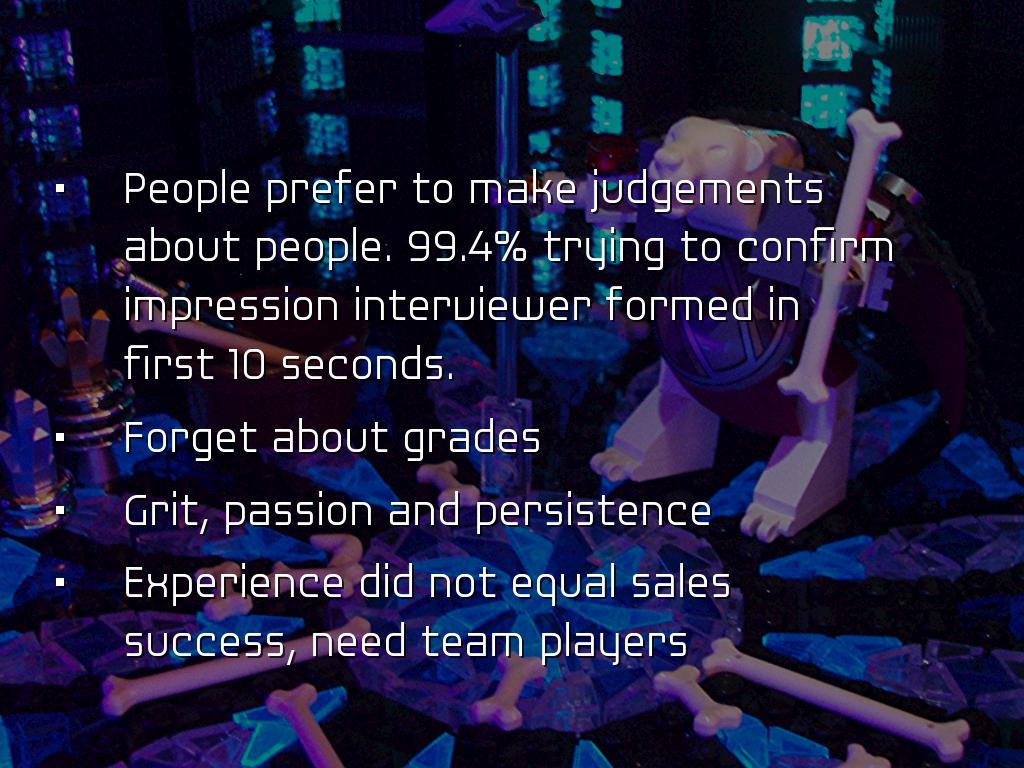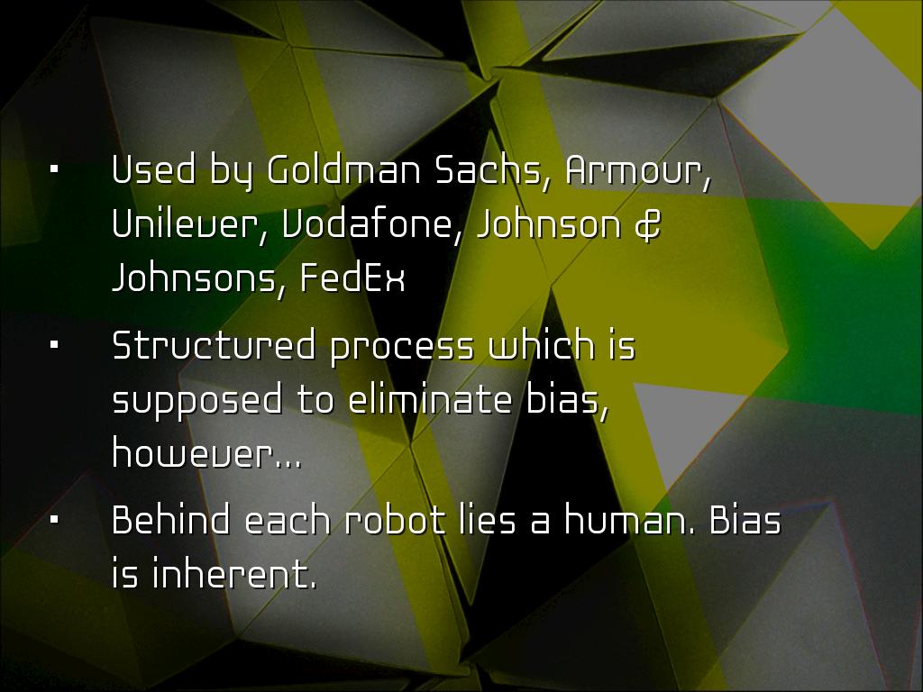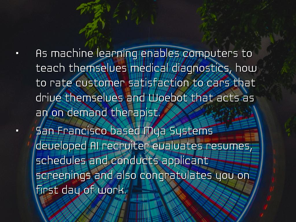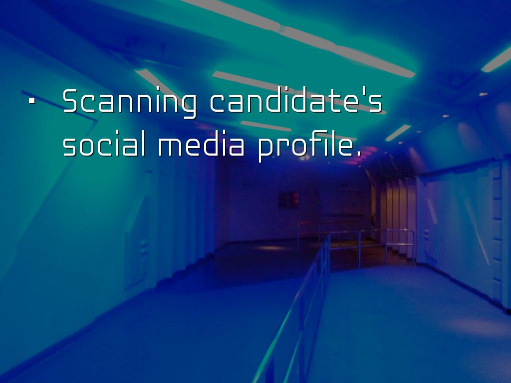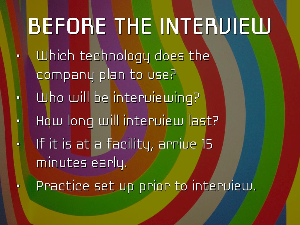 PRESENTATION OUTLINEVideo Conferencing Video Interviewing Pre-approval Mobile and global Use desktop, laptop, webcam, smartphone or tablet. WebEx Features WebEx-video teleconference Meet from any device. Just answer telephone. Personal meeting room. Screen sharing, white board and editing tools. Other Video Conferencing Google hangout Skype for Business AnyMeeting EzTalks Cloud Meeting Join me, Zoom, Vsee, GoToWebinar, Meeting Burner Job Interview Apps Interview Apps - a few Interview Assistant Interview Genius 51 most common interview questions JobJuice Prepare, Prepare, Prepare Some users reported, saw own face on screen, they felt uncomfortable. Took about 15 seconds used to seeing their face. Communication occurs through vocabulary, non verbal cues, tone of voice, inflection, pauses, facial expressions, manner of listening, microgestures, etc. Before the Interview Which technology does the company plan to use? Who will be interviewing? How long will interview last? If it is at a facility, arrive 15 minutes early. Practice set up prior to interview. What to Wear Consider a pastel rather than white which may glare. If wearing white, wear jacket to cut down on glare. Red should be avoided. No flashy jewelry, can catch the light. Try to avoid all light or all dark. Too much light clothing, camera automatically darkens. Face shadowed. Set-up at Home Test equipment Put computer solid surface Allow as much lighting as possible. Lighting in front of you, preferably from above. Background - blank wall Wear a bit more make-up If picture or window behind, see that light does not bounces off surface. End of Interview Questions Contact information? What next steps? Another interview? Who is main contact? Preferred contact method? Send interview thank you note. Untitled Slide People prefer to make judgements about people. 99.4% trying to confirm impression interviewer formed in first 10 seconds. Forget about grades Grit, passion and persistence Experience did not equal sales success, need team players Untitled Slide Used by Goldman Sachs, Armour, Unilever, Vodafone, Johnson & Johnsons, FedEx Structured process which is supposed to eliminate bias, however... Behind each robot lies a human. Bias is inherent. Untitled Slide As machine learning enables computers to teach themselves medical diagnostics, how to rate customer satisfaction to cars that drive themselves and Woebot that acts as an on demand therapist. San Francisco based Mya Systems developed AI recruiter evaluates resumes, schedules and conducts applicant screenings and also congratulates you on first day of work. Untitled Slide HireVue raised 95 million Video interview intelligence AI New app scans your face to tell company if you are worth hiring. Analyzes microgestures for subtle clues such as whether facial expressions contradict their words. Untitled Slide Voice and facial recognition lets employer compare candidate's vocabulary, tone and facial movements compared to their best hires. Algorithm analyzes and ranks responses, finds matches to company's top performers. Initial screening, candidates most closely matched are recruited. Untitled Slide Look at 4,000 candidates and within a few days whittle it down to the top 2% to 3%. It is not perfect, but it is faster and attempts to thwart human bias. Untitled Slide Might not be just video Applicant to prepare text question to send email to anxious customer with product question. Untitled Slide Tools make jobs more efficient, however inherently biased. Working on lessening human interventions, thereby reducing human bias. Untitled Slide Tips to prepare for video interviews: Untitled Slide Assesses which words he or she favors. Use please and thank you shows empathy and a possible disposition for working with customers. Untitled Slide Scanning candidate's social media profile. Untitled Slide Progressive Insurance, Wells Fargo & Hilton Head employ AI that analyzes callers' tone, tempo, keywords and grammar to route calls to agents with appropriate skills. The software from Mattersight, reduces call time by 23%. Untitled Slide Law offices use AI combination machine learning and natural language processing on millions of pages, understand a query's context and draft a memo. During the Interview Make eye contact with camera lens - imagine interviewer. Be yours. Think of interviewer sitting across table. No unnecessary noise. Avoid too much body motion. Dress professionally from head to toe. Refer resume & job description. Q Haiku Deck Pro User