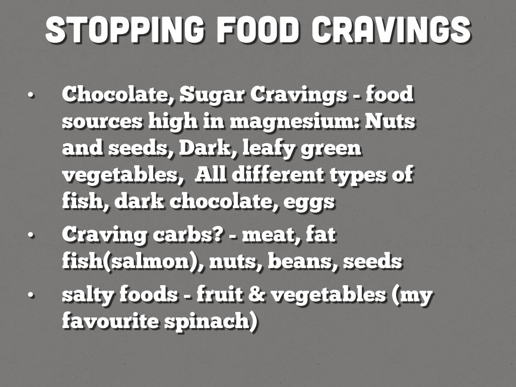 Chocolate, Sugar Cravings - food sources high in magnesium: Nuts and seeds, Dark, leafy green vegetables, All different types of fish, dark chocolate, eggs
