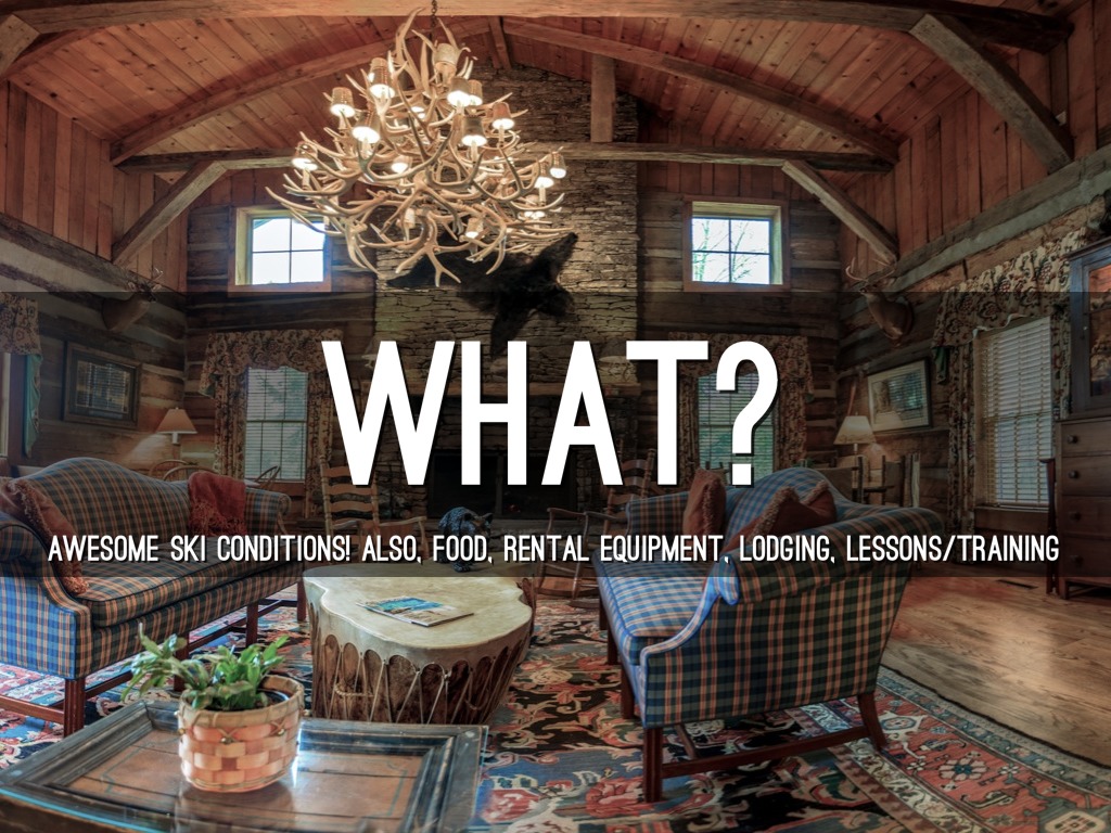 AWESOME SKI CONDITIONS! ALSO, FOOD, RENTAL EQUIPMENT, LODGING, LESSONS/TRAINING