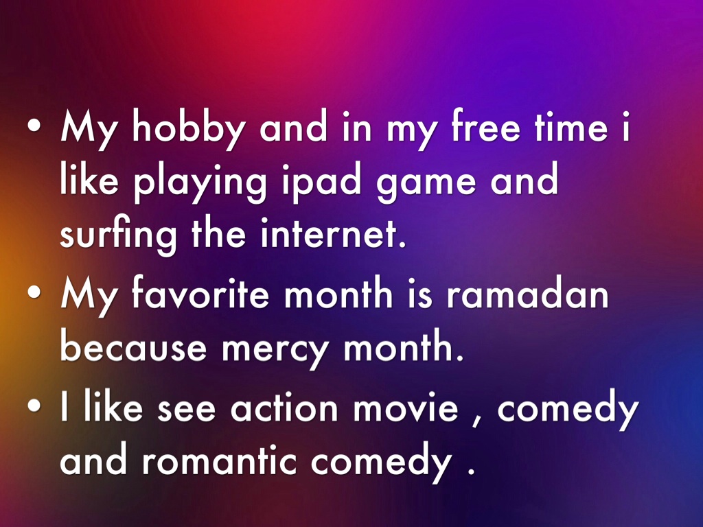 My hobby and in my free time i like playing ipad game and surfing the internet.