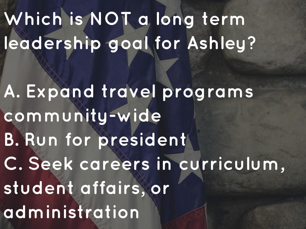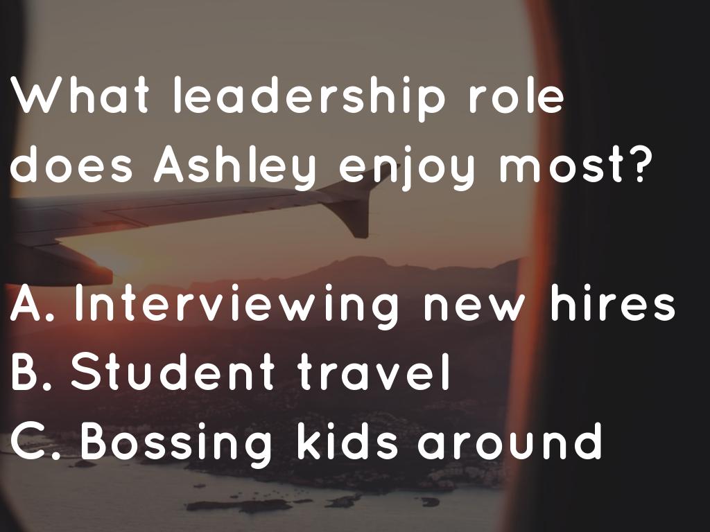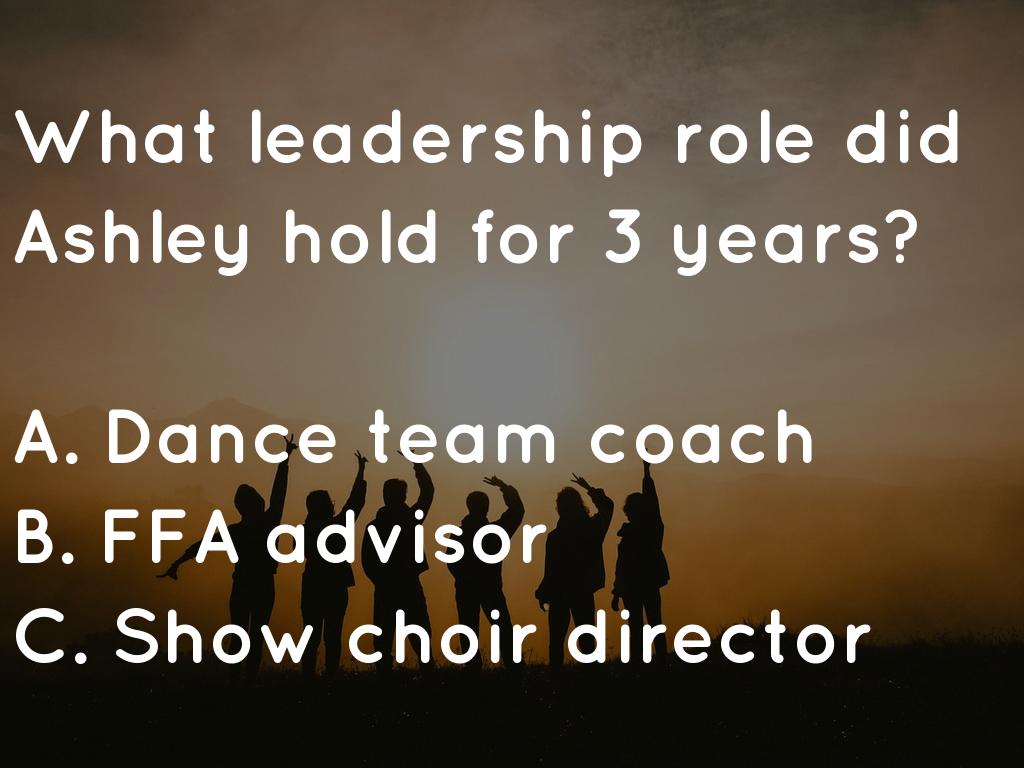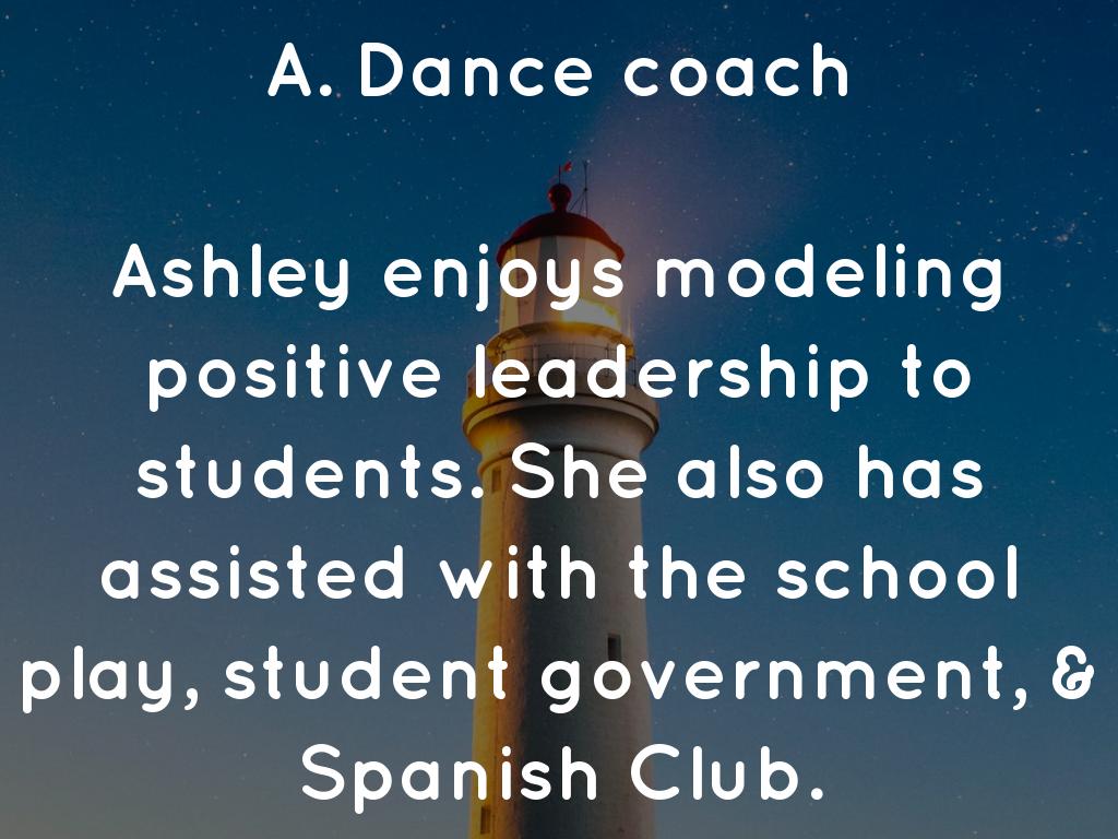 Ashley enjoys modeling positive leadership to students. She also has assisted with the school play, student government, & Spanish Club.