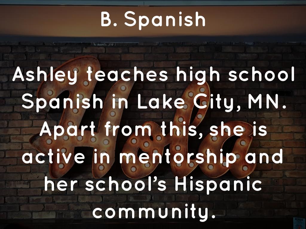Ashley teaches high school Spanish in Lake City, MN. Apart from this, she is active in mentorship and her school’s Hispanic community.