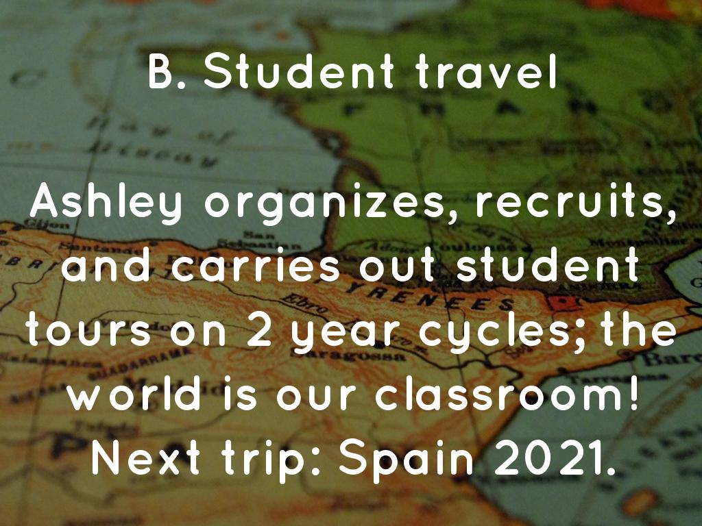 Ashley organizes, recruits, and carries out student tours on 2 year cycles; the world is our classroom! Next trip: Spain 2021.