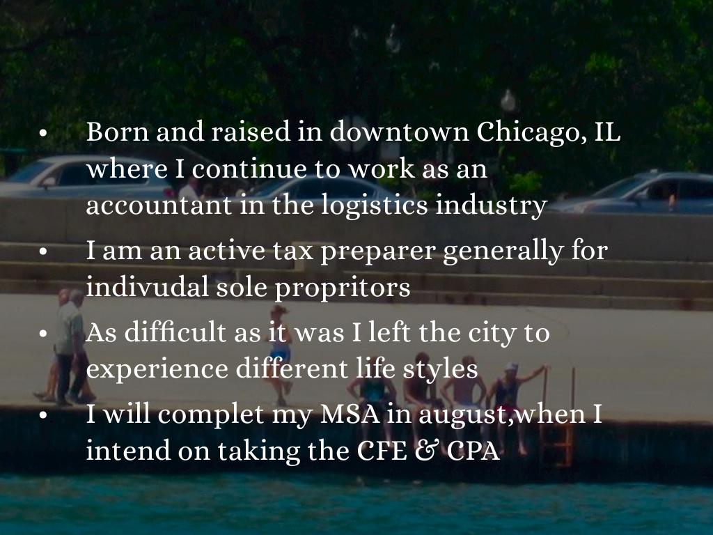Born and raised in downtown Chicago, IL where I continue to work as an accountant in the logistics industry