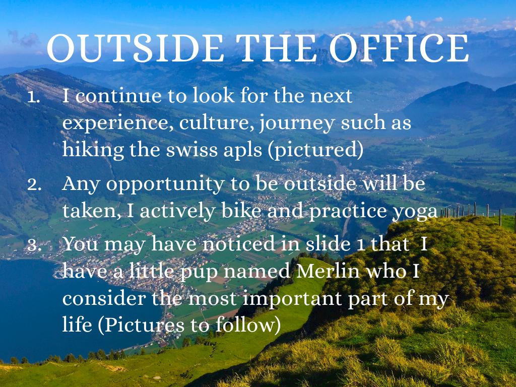 I continue to look for the next experience, culture, journey such as hiking the swiss apls (pictured)