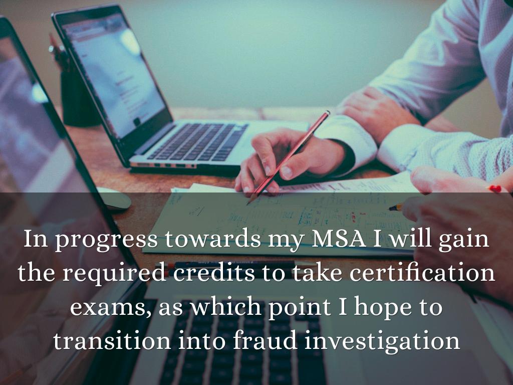 In progress towards my MSA I will gain the required credits to take certification exams, as which point I hope to transition into fraud investigation