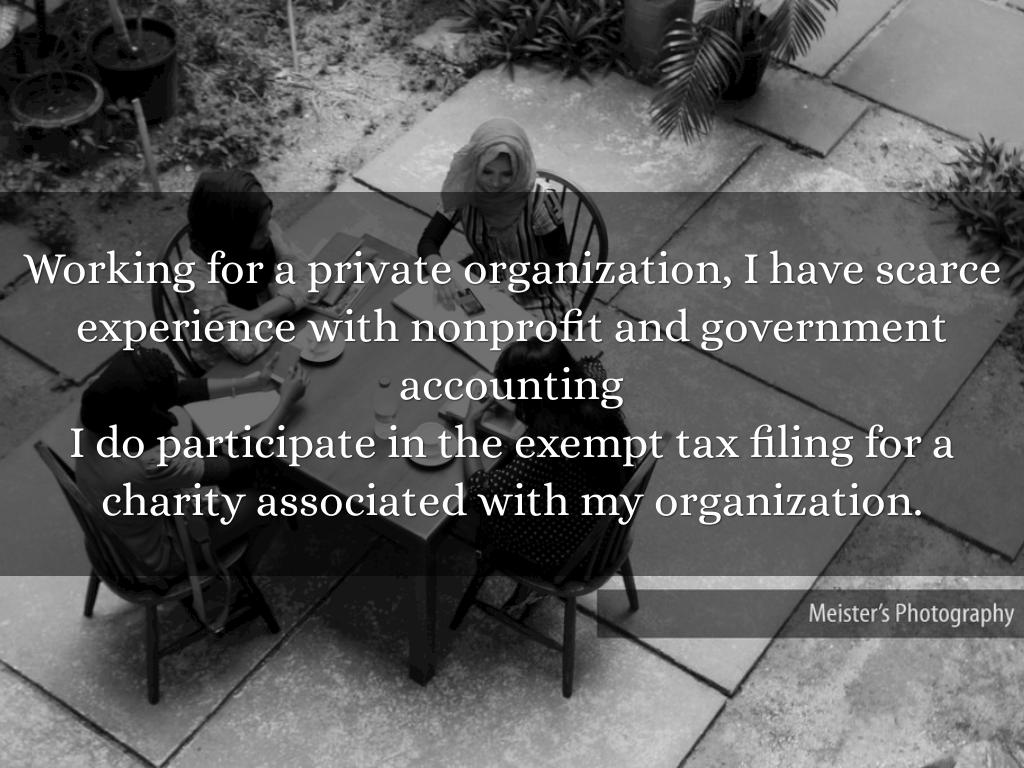 Working for a private organization, I have scarce experience with nonprofit and government accounting