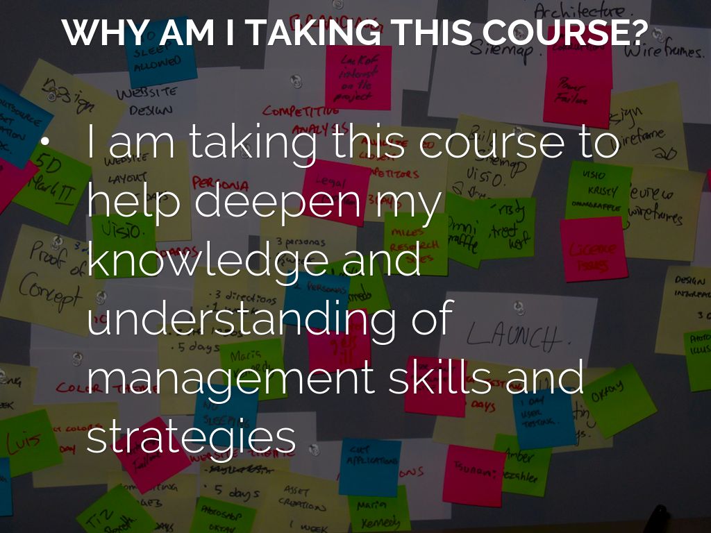 I am taking this course to help deepen my knowledge and understanding of management skills and strategies