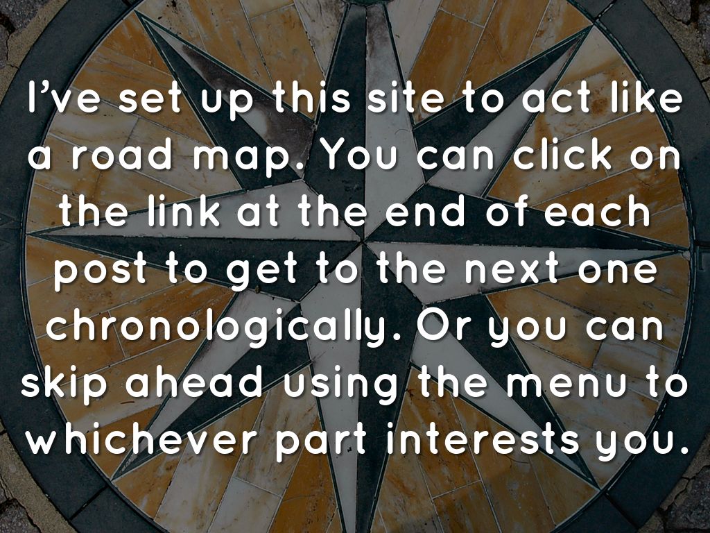 I’ve set up this site to act like a road map. You can click on the link at the end of each post to get to the next one chronologically. Or you can skip ahead using the menu to whichever part interests you.